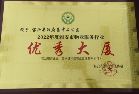 2022年11月24日,由雅安市住房中心、雅安市物业管理协会组织的“2022年度雅安市物业服务行业优秀大厦”(以下简称“市优”)复评组对我公司旗下的宝兴县和信物业管理有限公司进行“市优”复评。复评组一行充分肯定了宝兴县和信物业管理有限公司在我县政府集中办公区标准化服务成效,在复评中脱颖而出,被授予宝兴县政府集中办公区2022年度雅安市物业服务行业优秀大厦称号。