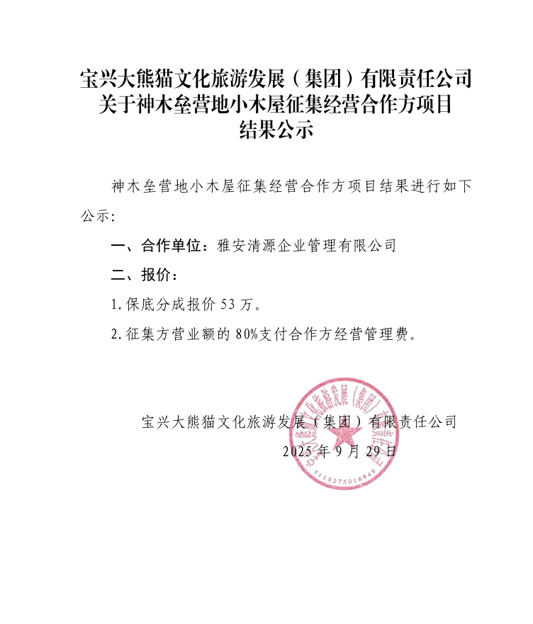 宝兴大熊猫文化旅游发展(集团)有限责任公司 关于神木垒营地小木屋征集经营合作方项目的公告
